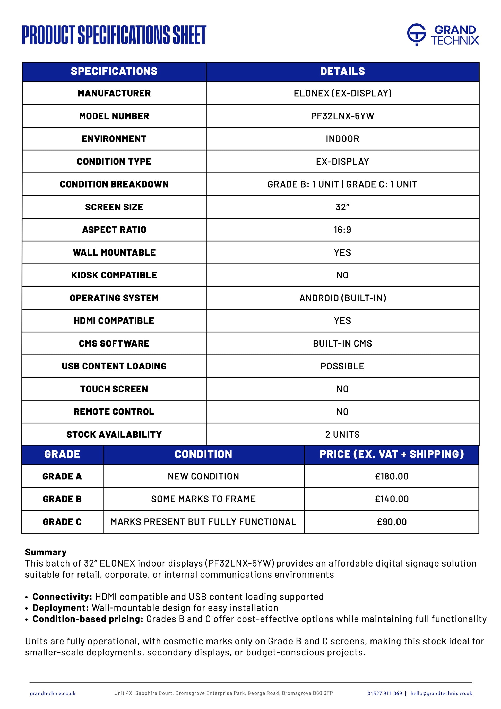 Units are fully operational, with cosmetic marks only on Grade B and C screens, making this stock ideal for smaller-scale deployments, secondary displays, or budget-conscious projects.